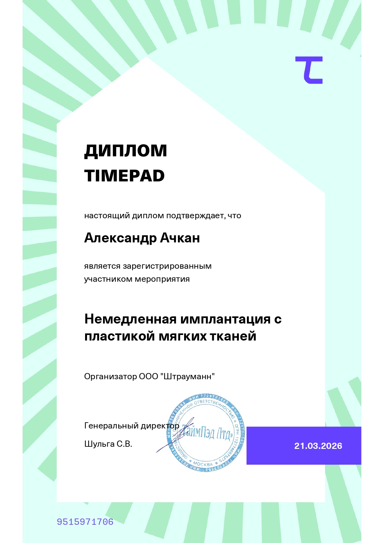 Я недавно обратился к стоматологу Ачкану Александру Александровичу и остался весьма доволен его работой! Этот доктор — отличный специалист, который всегда все подробно рассказывает и объясняет, а также не пытается навязать что-то лишнее. Ранее я уже был у него на приеме, когда он работал в клинике «Линия улыбки» на Чёрной речке.