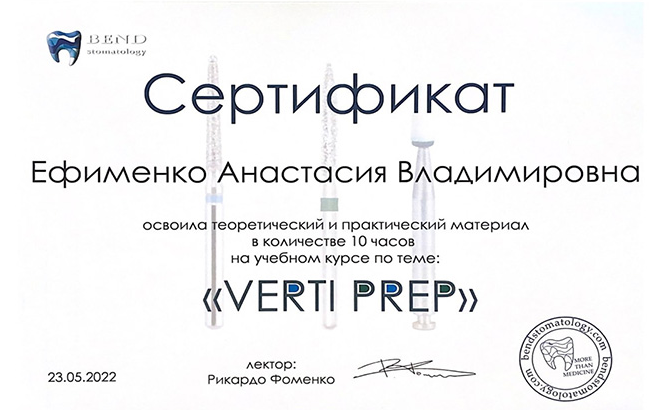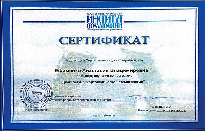 Федеральное государственное бюджетное образовательное учреждение высшего образования «Первый Санкт-Петербургский государственный медицинский университет имени академика И.П. Павлова» Министерства здравоохранения Российской Федерации. Свидетельство об аккредитации специалиста № 7822 006648623 от 14.07.2022г. первичная специализированная аккредитация по специальности стоматология ортопедическая.