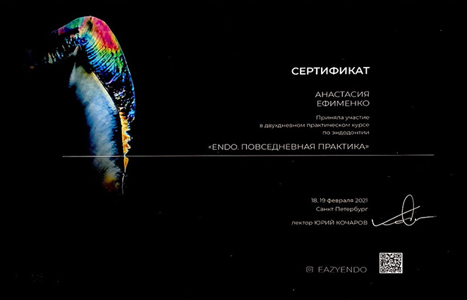 Федеральное государственное бюджетное образовательное учреждение высшего образования «Первый Санкт-Петербургский государственный медицинский университет имени академика И.П. Павлова» Министерства здравоохранения Российской Федерации. Свидетельство об аккредитации специалиста № 7723 00398646 от 30.03.2021г. первичная аккредитация по специальности стоматология.