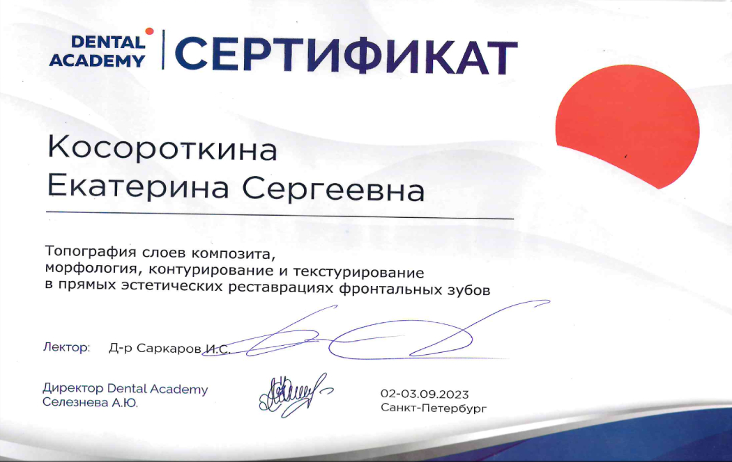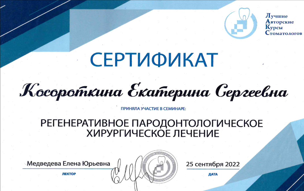 2016 г. - повышение квалификации по хирургической стоматологии ФГБОУ ВО «ЧГУ им. И.Н. Ульянова»