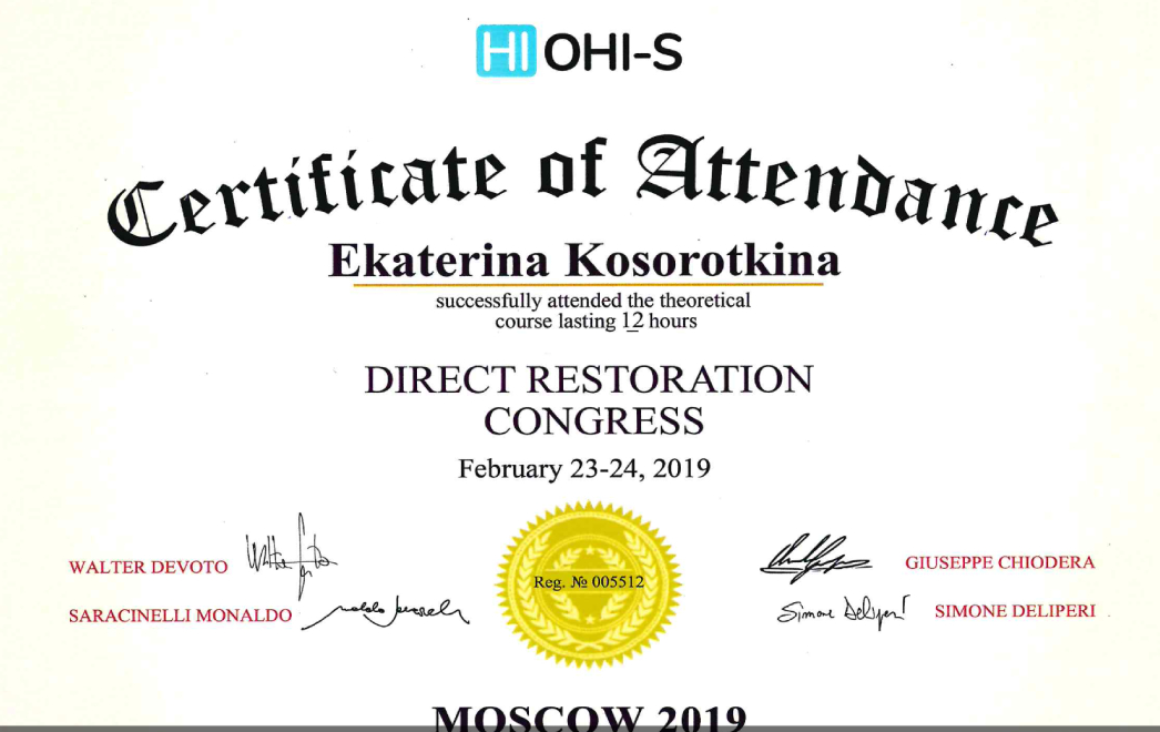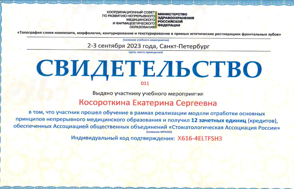 2016 г. – повышение квалификации по терапевтической стоматологии ГАУ ДПО «Институт усовершенствования врачей» Минздрава Чувашии