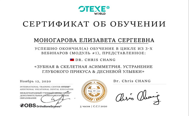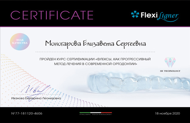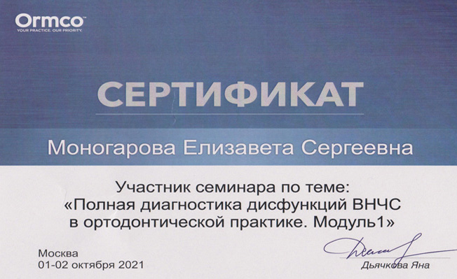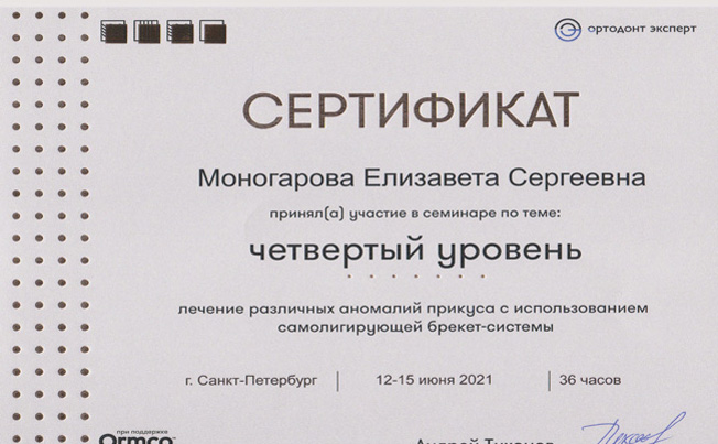 Федеральное государственное бюджетное образовательное учреждение высшего образования «Северо-Западный государственный медицинский университет имени И.И. Мечникова» Министерства здравоохранения Российской Федерации. Свидетельство об аккредитации специалиста №772300187826, протокол № 67 от 10.09.2021г. по специальности ортодонтия.