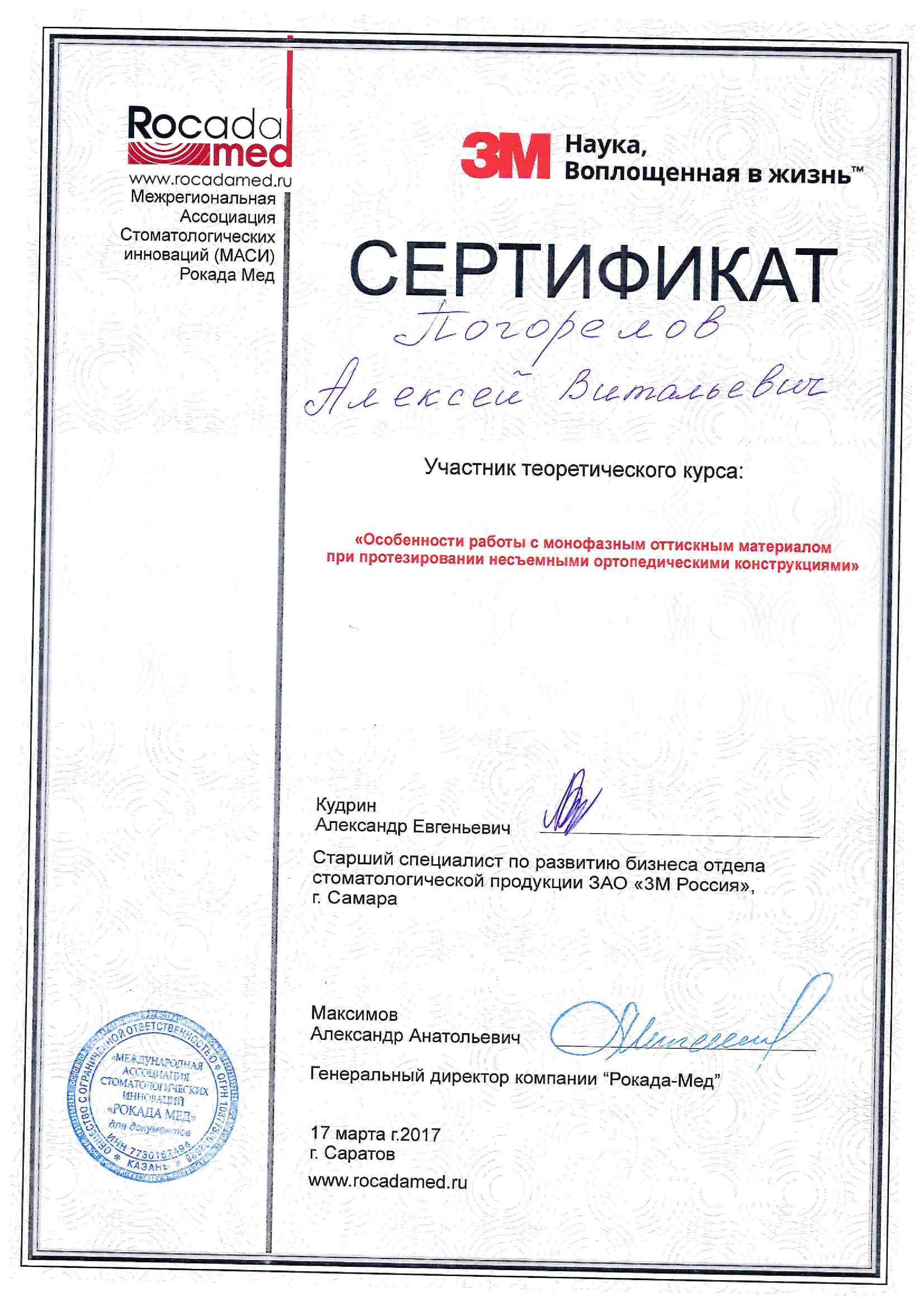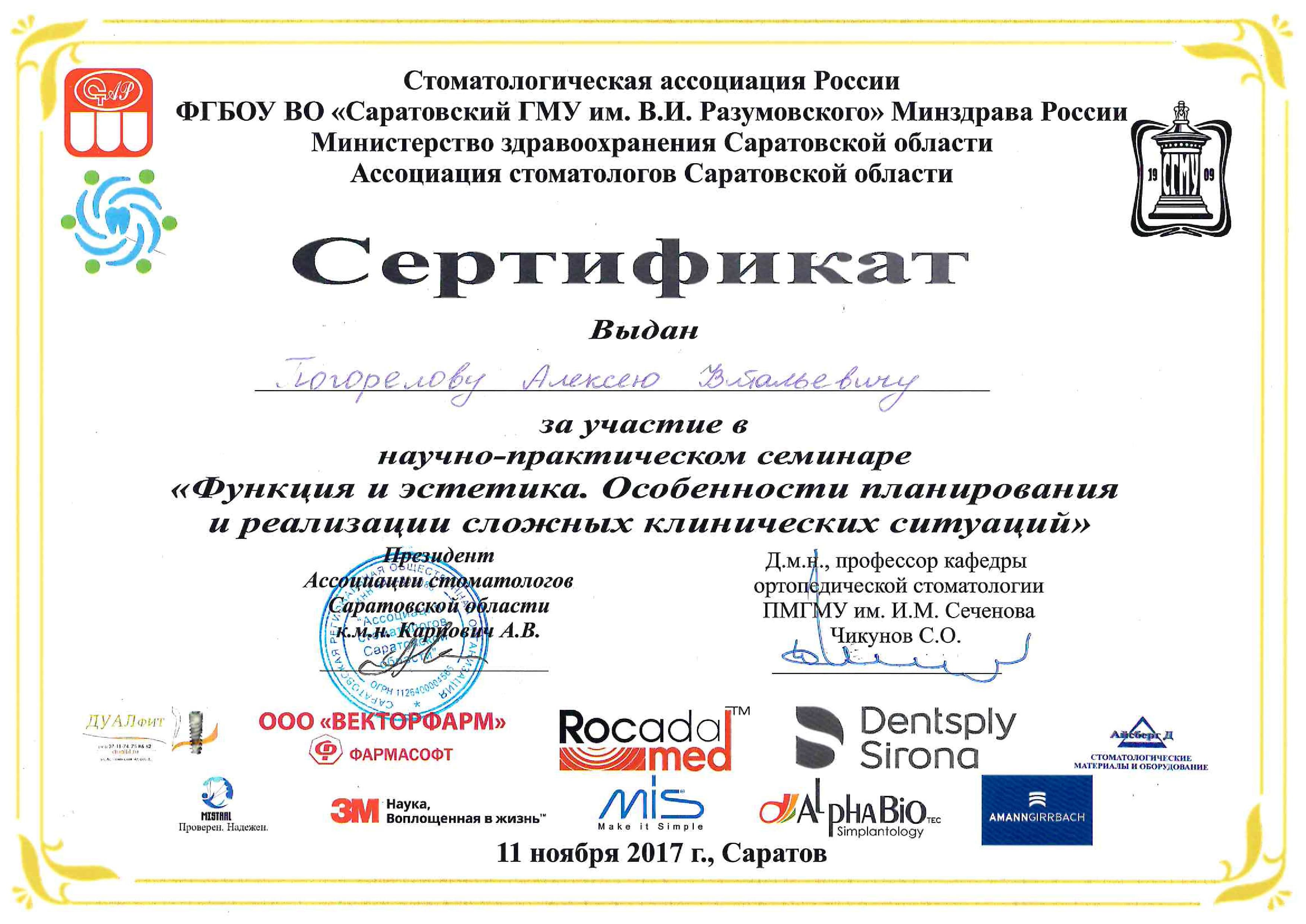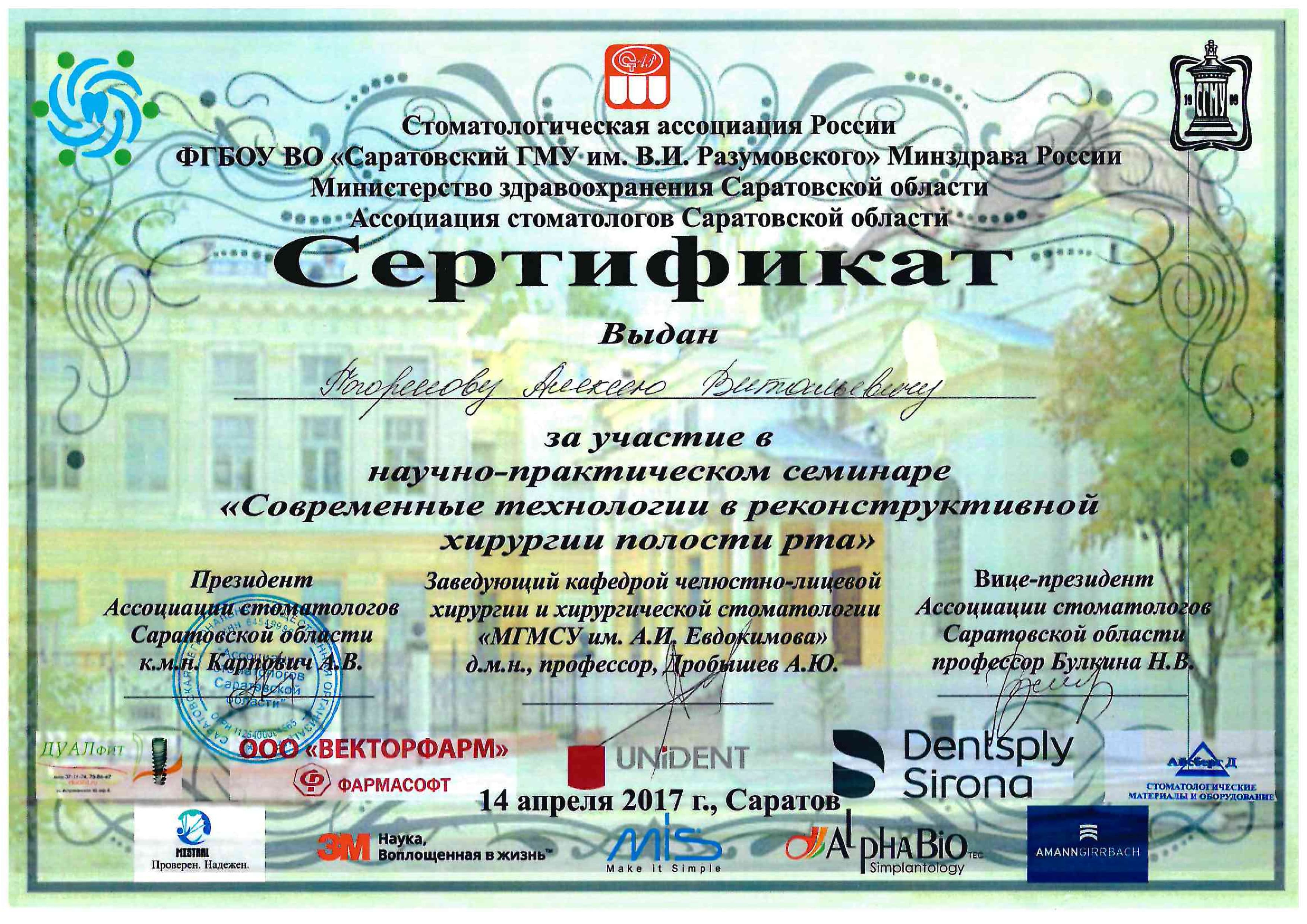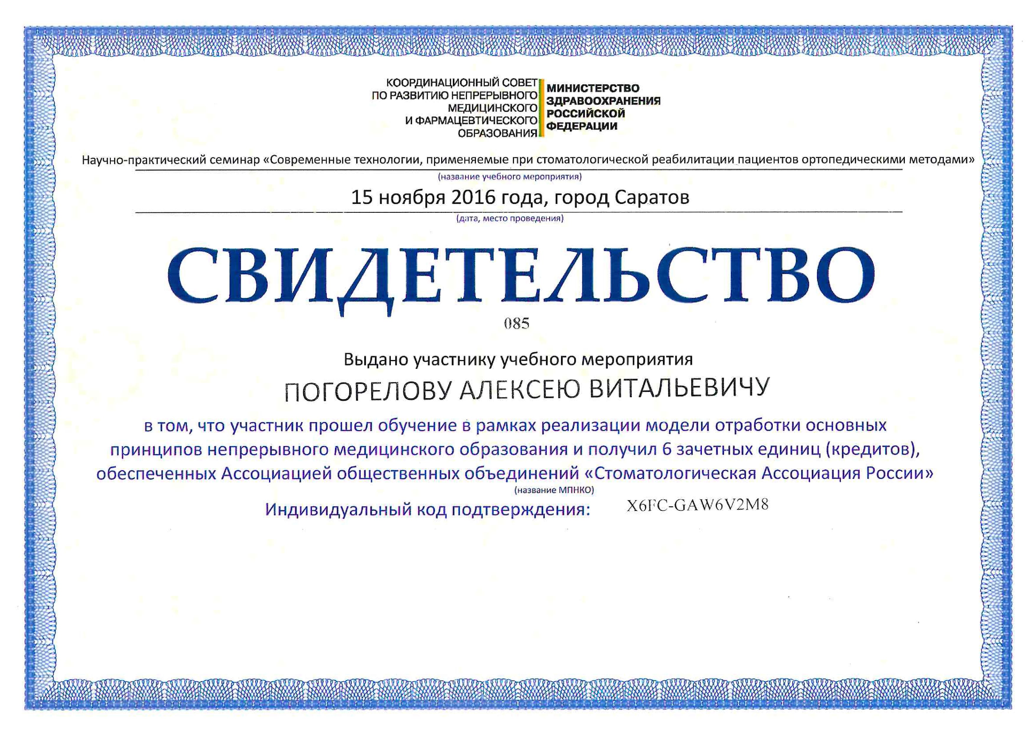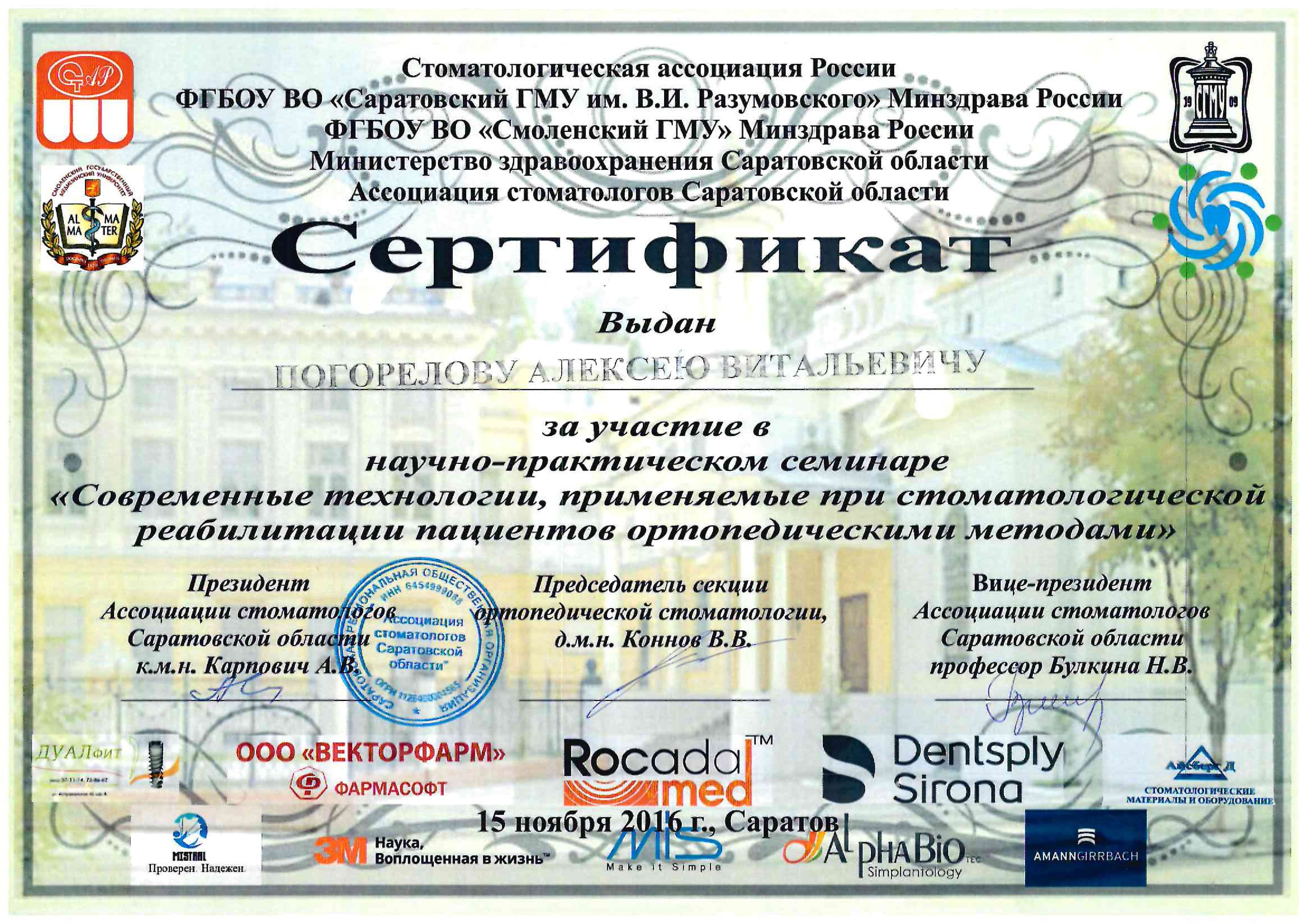 2016 г. — ФБГОУ ВО "Смоленский ГМУ". Научно-практический семинар "Современные технологии, применяемые при стоматологической реабилитации пациентов ортопедическими методами".