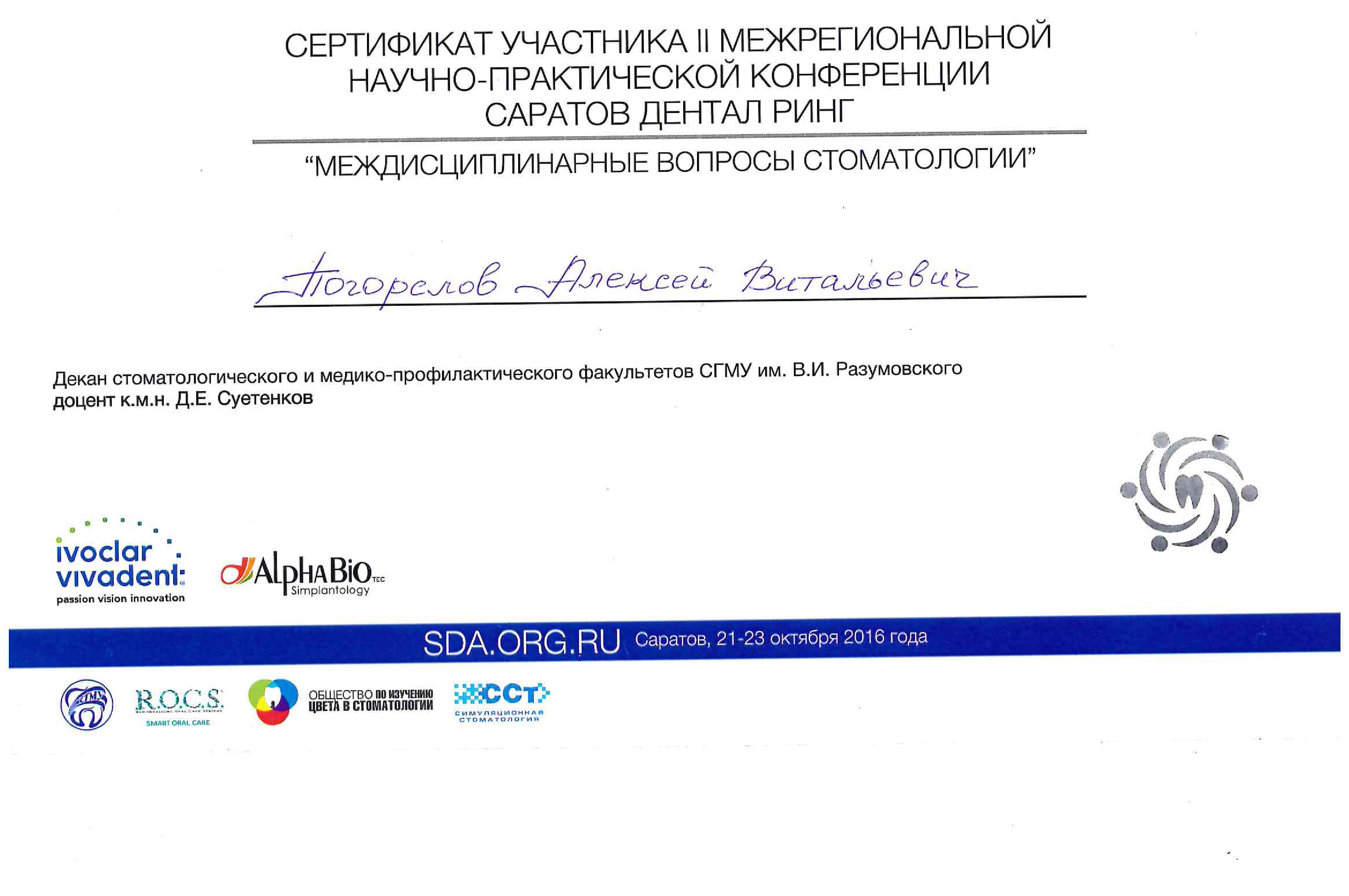 2016 г. — Саратовский государственный медицинский университет имени В.И. Разумовского. II Межрегиональная научно-практическая конференция Саратов Дентал Ринг "Междисциплинарные вопросы стоматологии".