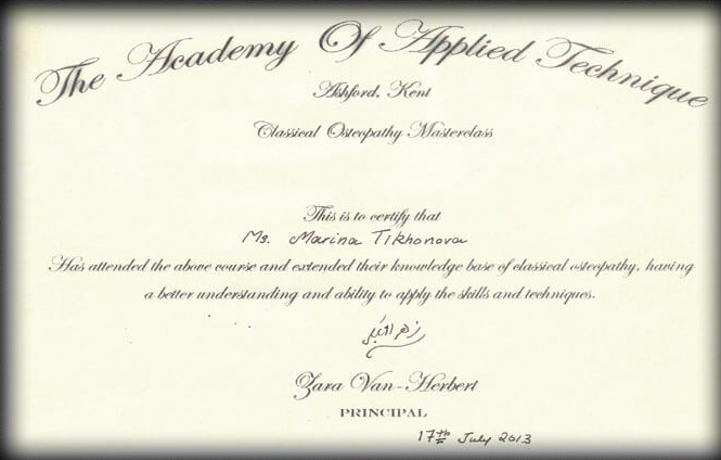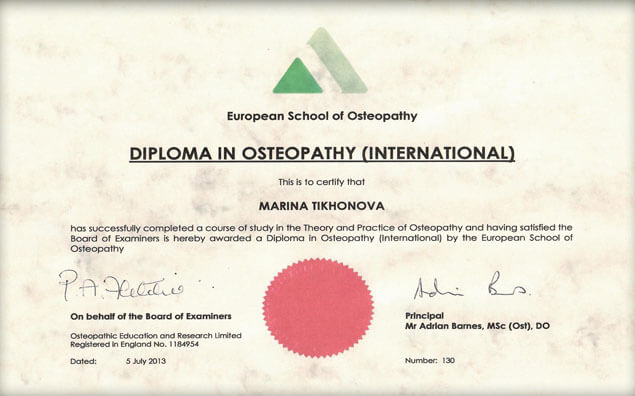 European School of Osteopathy, Diploma in osteopathy (international), № 130 от 05.07.2013г.