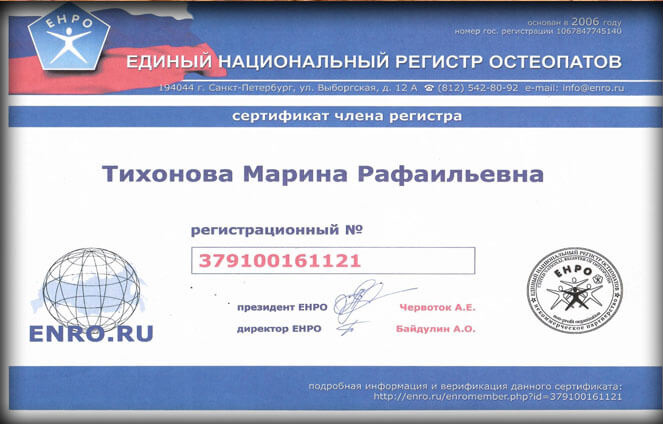 Сертификат члена регистра, Единый национальный регистр остеопатов, рег.№379100161121